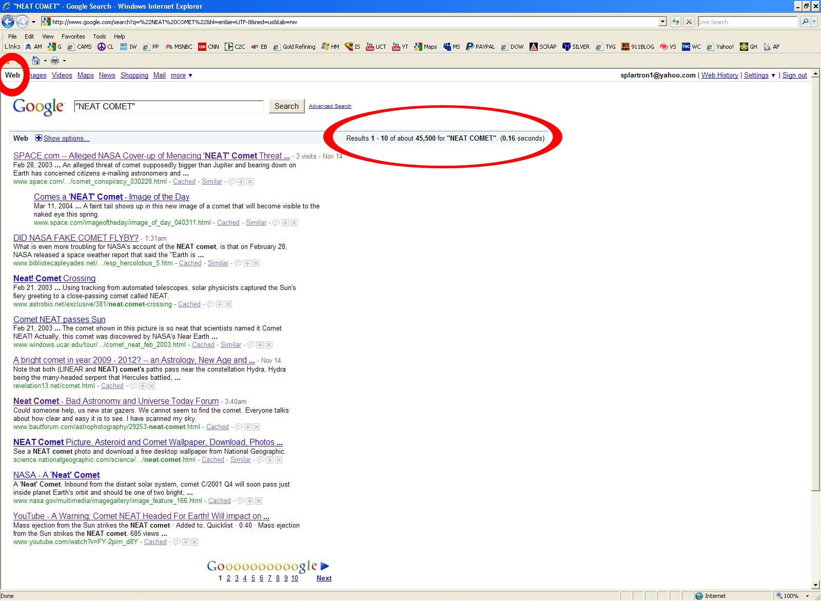 NEAT SUPPRESSION PAGE 3 OF 3 I, BEING A QUESTIONING MAN, DECIDED TO OPEN AN ACCOUNT AT THE ASTRONOMY.COM FORUM TO ASK SOME SIMPLE QUESTIONS. I WENT ON AND WAS AS POLITE AND POSED THE QUESTION "WHAT DO YOU PROFESSIONAL ASTRONOMERS MAKE OF ALL THIS NEAT COMET STUFF?" WITHIN A FEW HOURS MY THREAD WAS DELETED. I SENT AN EMAIL TO THE MOD ASKING WHY ======================================================== 11-15-2009 08:35 PM - austexdude Hi Sir...